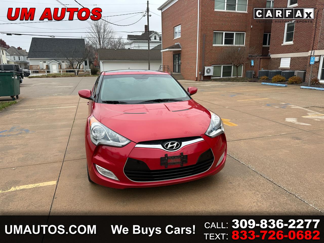 2013 HYUNDAI VELOSTER, 110,422 MILES, 2 DOOR COUPE, AC, CD, CRUISE, BACK UP CAMERA, XM RADIO, TINTED WINDOWS, SUNROOF, NAVIGATION, 1.6 L 4 CYL ENGINE, FOG LIGHTS, VERY SPORTY, VERY LOW MILES FOR THE YEAR, RUNS AND DRIVES GREAT, A NEW CAR TRADE IN, CLEAN CARFAX REPORT, EXCELLENT MAINTANANCE HISTORY, RED AND READY, FOR MORE INFO PLEASE CALL US AT 309-836-2277, UMAUTOS.COM